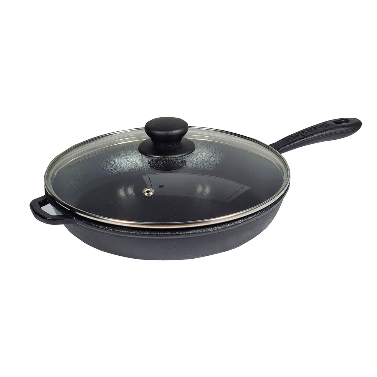 Tigaie din fontă cu mâner metalic 28x6 cm cu capac din sticla – durabilă, pentru gătit uniform